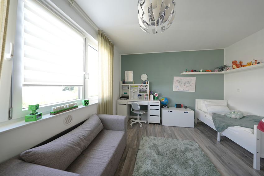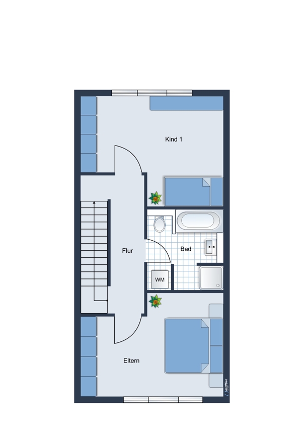 Dieses präsentiert sich mit 2 großzügigen und taghellen Kinderzimmern. In der Mitte des OGs ist das schicke Tageslichtbad.