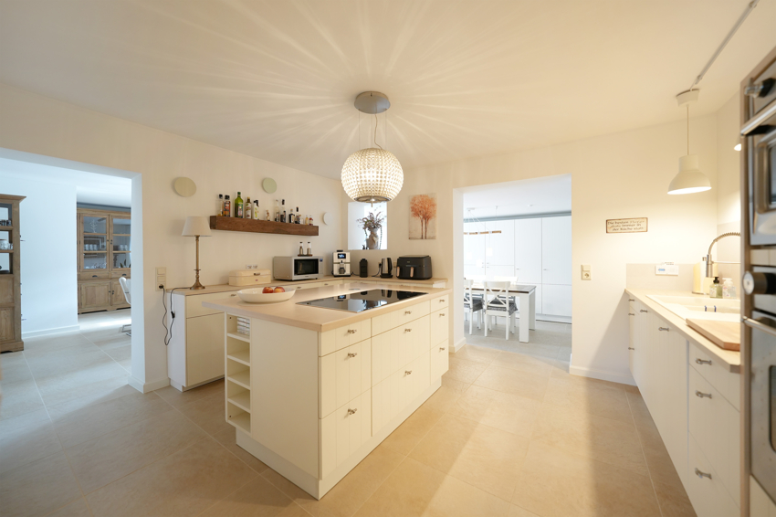 Die topmoderne Küche mit allen nötigen und zeitgemäßen Geräten wird jedem Anspruch eines Hobbykochs gerecht. Sie möchten nur mal eben eine Kleinigkeit essen oder unkompliziert frühstücken? Es gibt einen zusätzlichem Frühstücksplatz mit direktem Zugang zur Hofzufahrt, ideal für den bequemen Transport von Einkäufen direkt ins Haus.