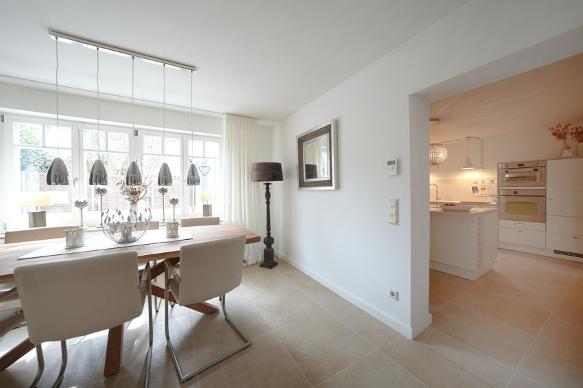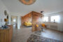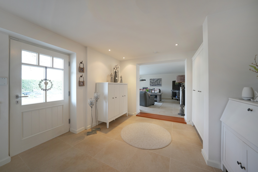 Es empfängt Sie eine großzügige Diele mit hellen Naturstein-Bodenplatten. Beeindruckend groß und zugleich anheimelnd-gemütlich ist der lichtdurchflutete Wohn-/ Essbereich.