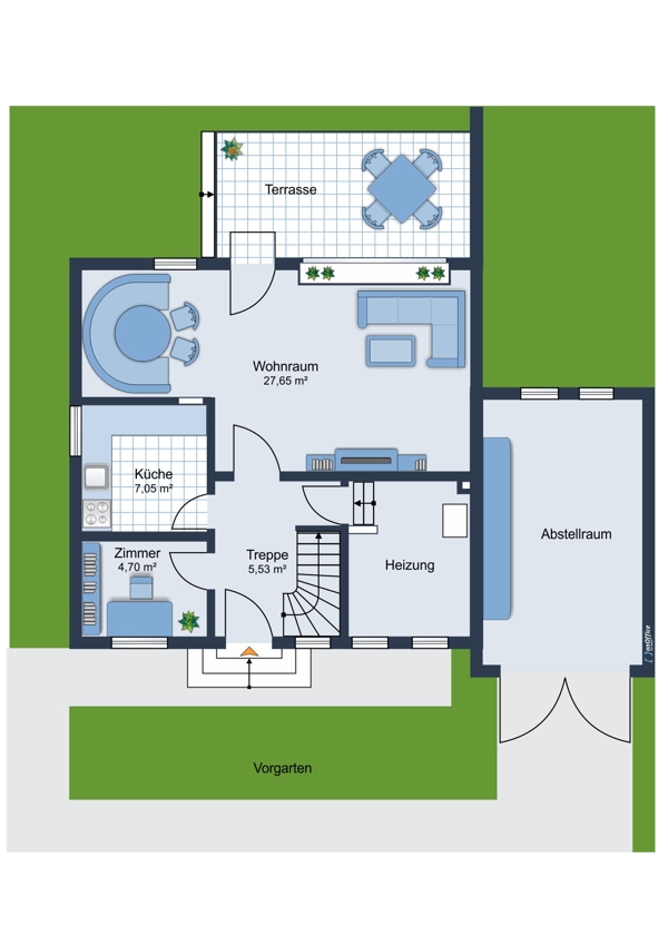 Der große Wohnbereich verläuft in südlicher Richtung und ist dadurch optimal belichtet. Ein direkter Zugang zum Garten ist vorhanden.