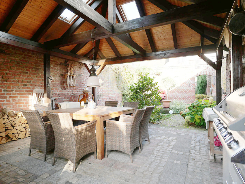 Im Erdgeschoss befindet sich die lichtdurchflutete Wohnküche mit Terracotta-Böden. Das mediterrane Thema wurde bei der Gartengestaltung geschickt wieder aufgegriffen: Hier befinden sich stimmungsvolle Patio-Bereiche, ein Freiluft-Refugium für einen wunderbar entspannten Aufenthalt im Garten, zum Teil abgeschirmt und versteckt zwischen historischen Steinen. Dahinter erstreckt sich eine imposante Rasenfläche, an dessen Kopfende sich eine Blockhütte befindet.