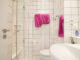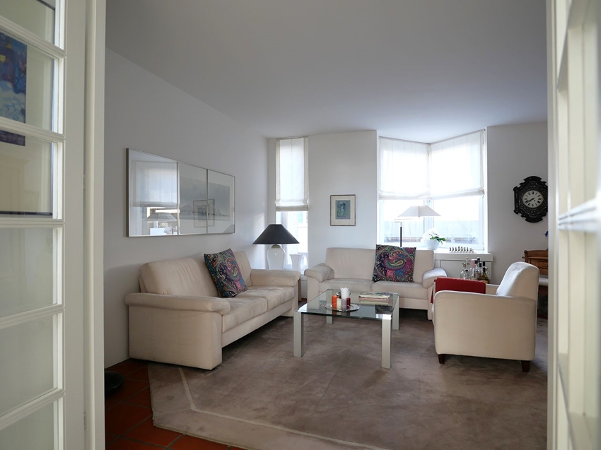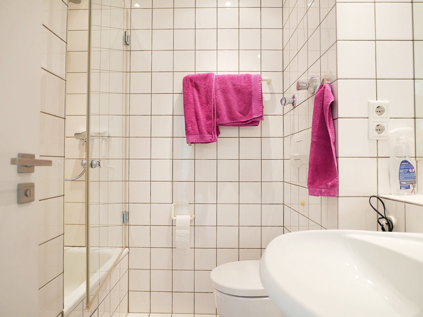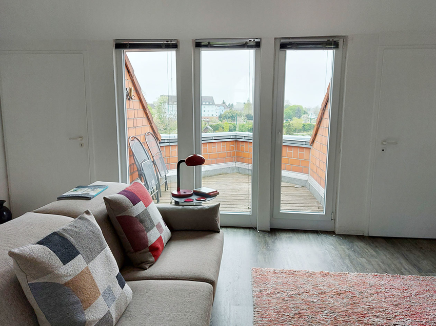 Der oberste Teil der Wohnung ist nicht nur über die interne Treppe zu erreichen, sondern auch vom allgemeinen Treppenhaus. Hier gibt es neben einem weiß gefliesten Duschbad und Ankleidebereich ein großes Schlaf- oder Gästezimmer. Der Bereich lässt sich aufgrund des eigenen Eingangs auch prima als Büro oder separat zu vermietendes Apartment nutzen.