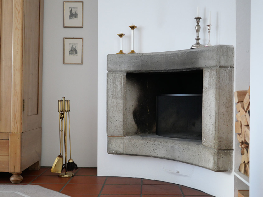 Zurück im Haus gelangen Sie eine halbe Etage höher in den Wohnbereich mit offenem Kamin. Dank einer doppelflügigen Glas-Kassettentür können Sie den Wohnbereich sowohl offen als auch geschlossen gestalten.
