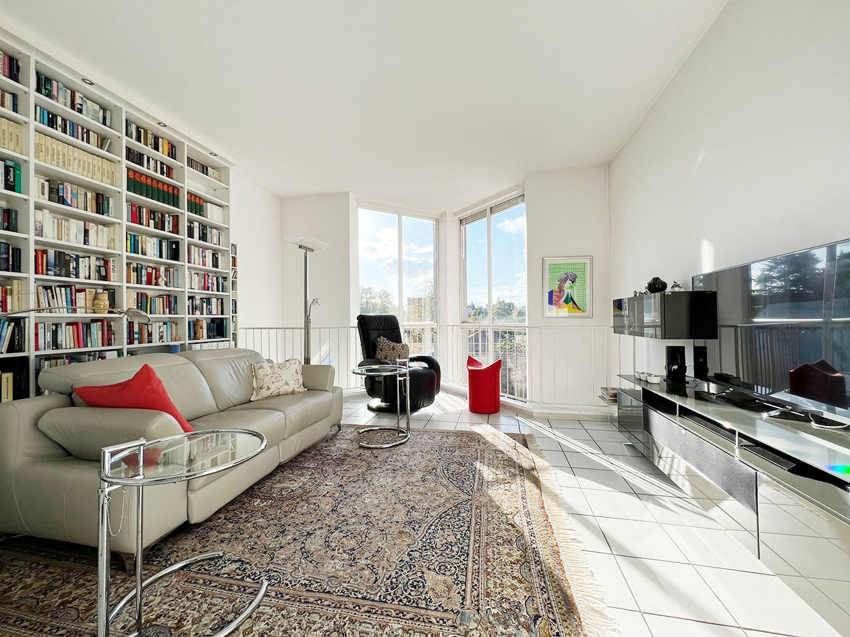Gartenseitig - auf einer Empore - liegt ein lichtdurchfluteter Lese- und Officebereich, der mit deckenhohen Bücherregalen ausgestattet ist.