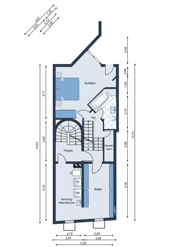 Der Schlafbereich ist separiert und liegt im Souterrain des Hauses. Das Schlafzimmer gewinnt dank der großen Fenster viel Tageslicht und hat zudem einen eigenen Gartenzugang. Ein angrenzendes Bad mit Wanne und Dusche und ein begehbarer Kleiderschrank runden das Raumangebot ab. Von hier gelangen Sie in den Kellerbereich. Hier gibt es neben dem üblichen Hausanschlussraum mit Waschmaschinenanschluss einen großen Vorratsraum.