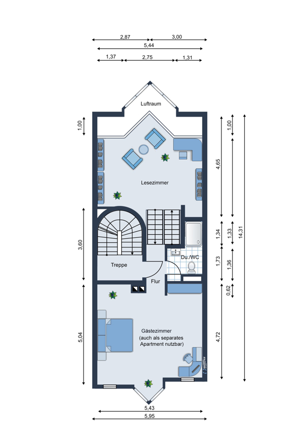 Die Einliegerwohnung ist über das allgemeine Treppenhaus erreichbar. Die 2,5 Zimmerwohnung bietet ein tolles Wohnzimmer mit zwei kleinen Abstellräumen. Der Erker präsentiert sich hier als Sonnenbalkon mit Weitblick über die benachbarten Gärten. Drei Stufen höher - straßenseitig - liegt die Wohnküche. Von hier aus führt eine Treppe in den Spitzboden des Hauses, der als Schlafzimmer ausgebaut wurde. Diese Fläche ist wohnbaurechtlich nicht genehmigt. Ein weiß gefliestes Duschbad mit Waschmaschinenanschluss rundet das Raumangbot ab.