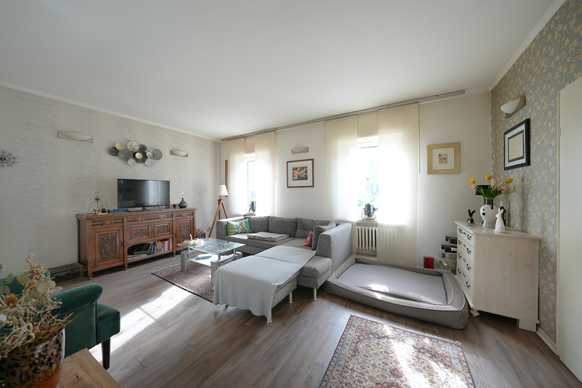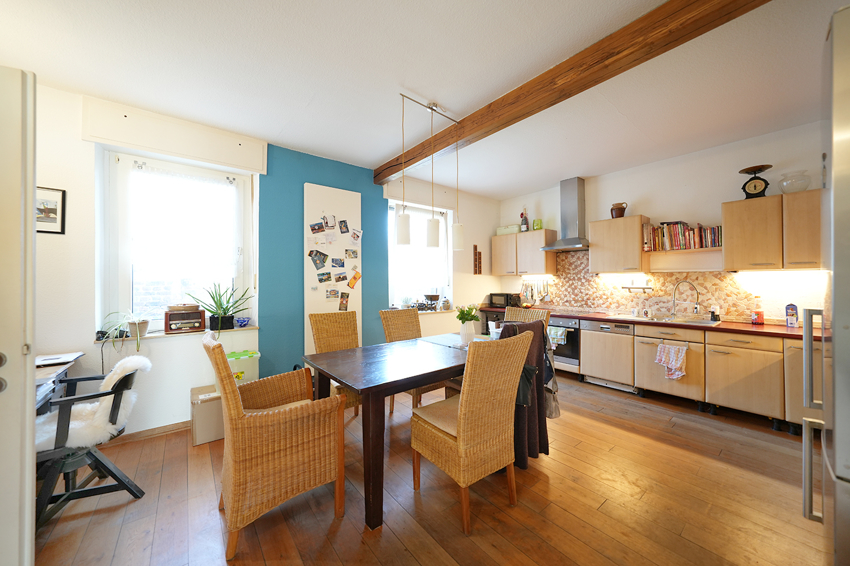 Das Erdgeschoss bietet straßenseitig einen großen Wohnbereich mit angrenzender Wohnküche. Sehr angenehm: Genug Platz für´s Kochen und Essen und einen entspannten Grünblick in den Garten.