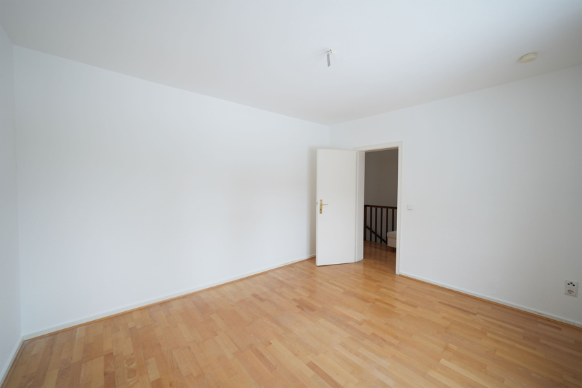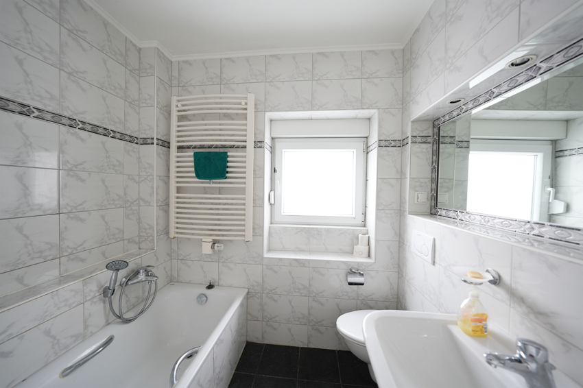 Zurück im Haus führt eine offene Treppe mit Holzstufen in das Obergeschoss. Hier befinden sich drei große Schlafzimmer sowie ein in weiß gehaltenes Tageslichtbad mit Wanne und Dusche.