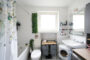 - Hellgrau gefliestes Wannenbad mit Fenster