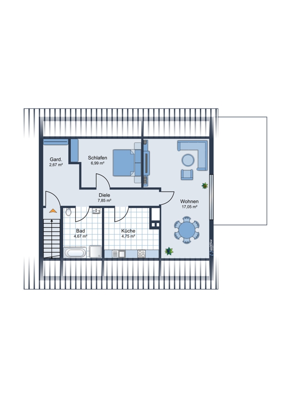 Über die Diele sind alle Räume bequem erreichbar. Das Schlafzimmer liegt zur Gartenseite der Wohnung. Rechter Hand der Diele befinden sich die Küche sowie das Tageslichtbad mit Badewanne. Das großzügig geschnittene Wohnzimmer liegt am Ende der Diele und bietet vielfältige Möglichkeiten zur individuellen Raumgestaltung. Eventuell bietet es sich an, den Grundriss zu verändern und die Küche zum Wohnzimmer hin zu öffnen.