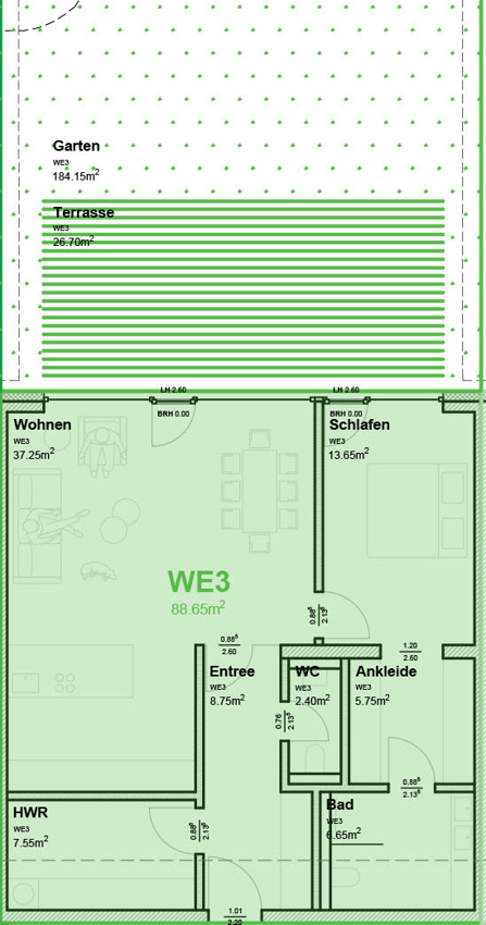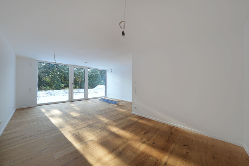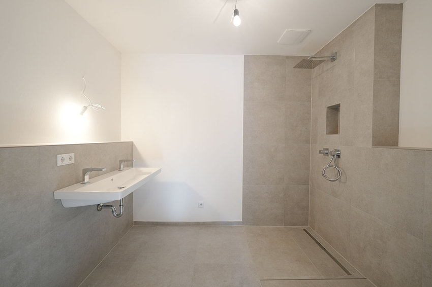 Die üppig grüne Natur auf der Rückseite des Hauses haben Sie von Wohnung 3 immer gut im Blick und können sie als Gartenbesitzer:in sogar aktiv mitgestalten. Zum Glück ist die Rasenfläche nicht riesig und schnell gemäht, so bleibt genug Zeit für ein kleines Sonnenbad oder einen Sundowner-Drink auf Ihrer herrlichen Süd-Terrasse. Das Master-Schlafzimmer ist über eine praktische Ankleide mit dem dahinterliegenden Badezimmer verbunden. Hier endet oder startet der Tag in einer modernen, bodengleichen Ganzglas-Dusche mit Regenwaldbrause.