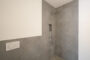 Das schicke Badezimmer ist mit großformatigen Fliesen und bodengleicher, verglaster Dusche ausgestattet.