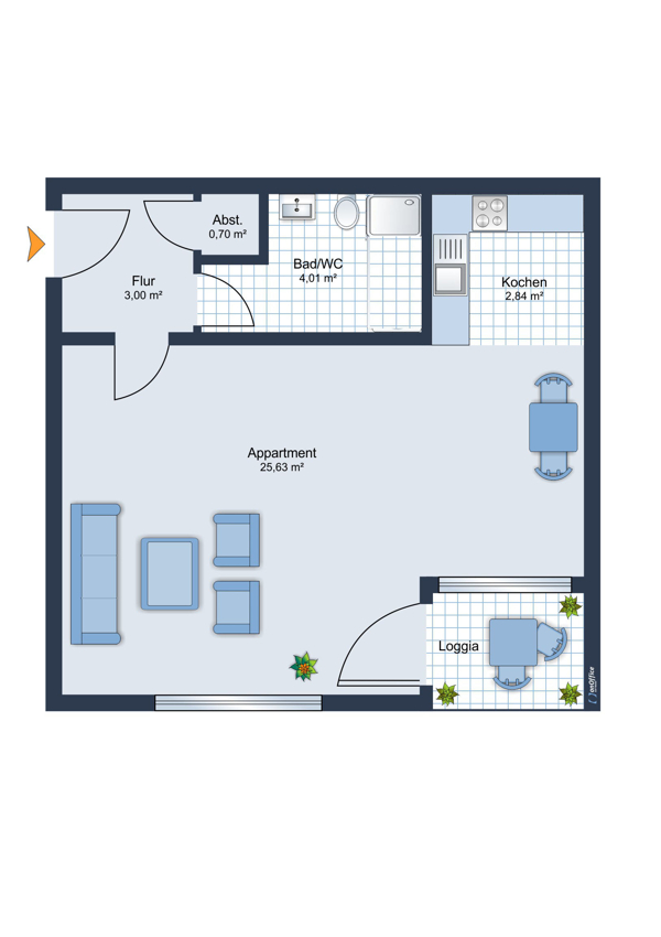 Die Aufteilung ist wie folgt: Von der zentralen Diele gelangen Sie gegenüber ins neue Duschbad und linker Hand in den rund 25 m² großen Wohn-/Schlafbereich. Die offene Küche schließt sich dem Wohnbereich an.