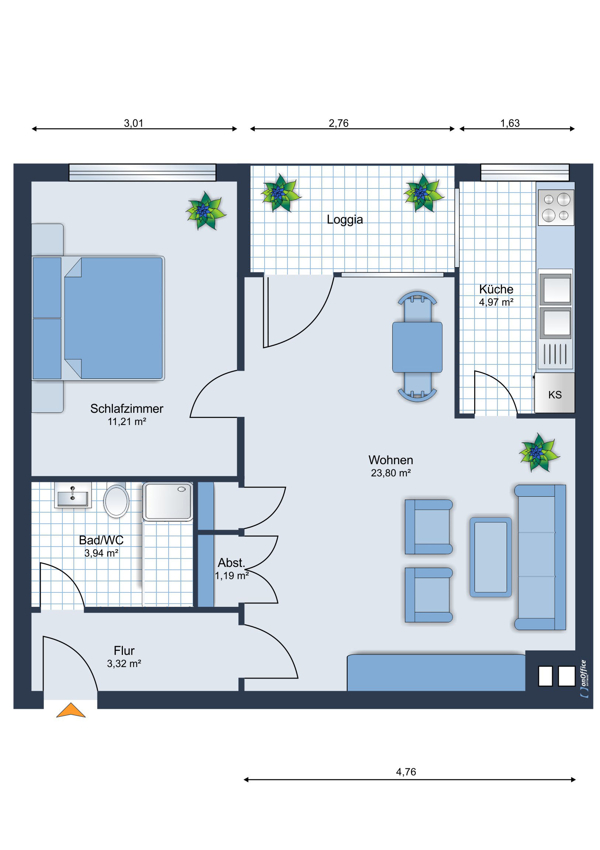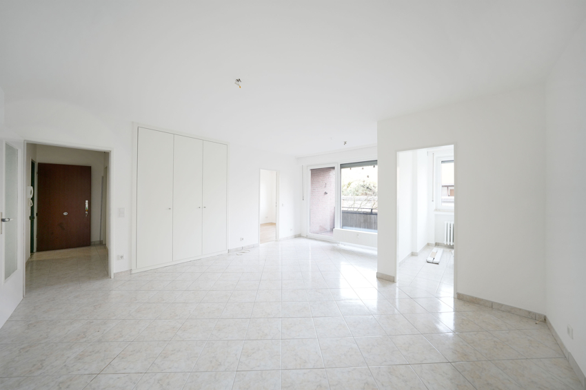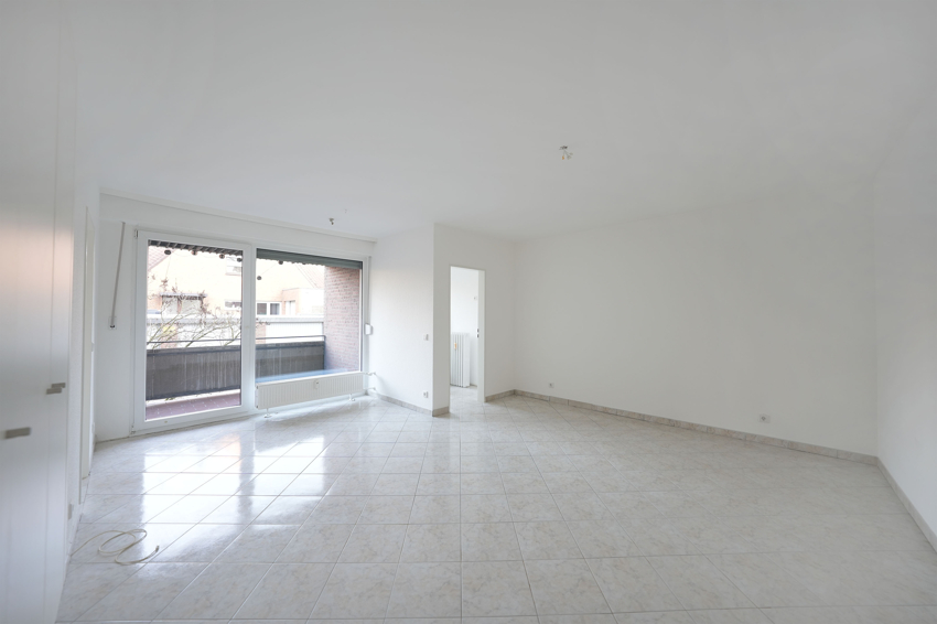Die Aufteilung ist klassisch-bewährt: Über die Diele gelangen Sie in das hell geflieste Bad sowie in das großzügige, offene Wohnzimmer mit Zugang zum Balkon und zur separierten Küche.