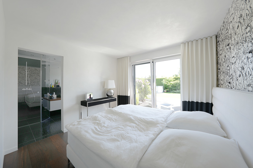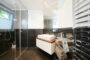Zurück in der Wohnung liegt angrenzend an den Wohnbereich das Elternschlafzimmer mit separater Ankleide und Bad en Suite. Dieses ist mit formschönen Sanitärobjekten, bodengleicher Dusche und Wanne versehen. Schwarze, topaktuelle Fliesen, perfekt abgestimmtes Design, Tageslicht und LED-Downlights sorgen für einen entspannten und gut ausgeleuchteten Start in den Tag.