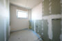 Rechter Hand liegt das Tageslichtbad mit ebenerdiger Dusche. Das Bad wird zeitlos mit großformatigen sandfarbenen Fliesen ausgestattet.