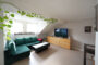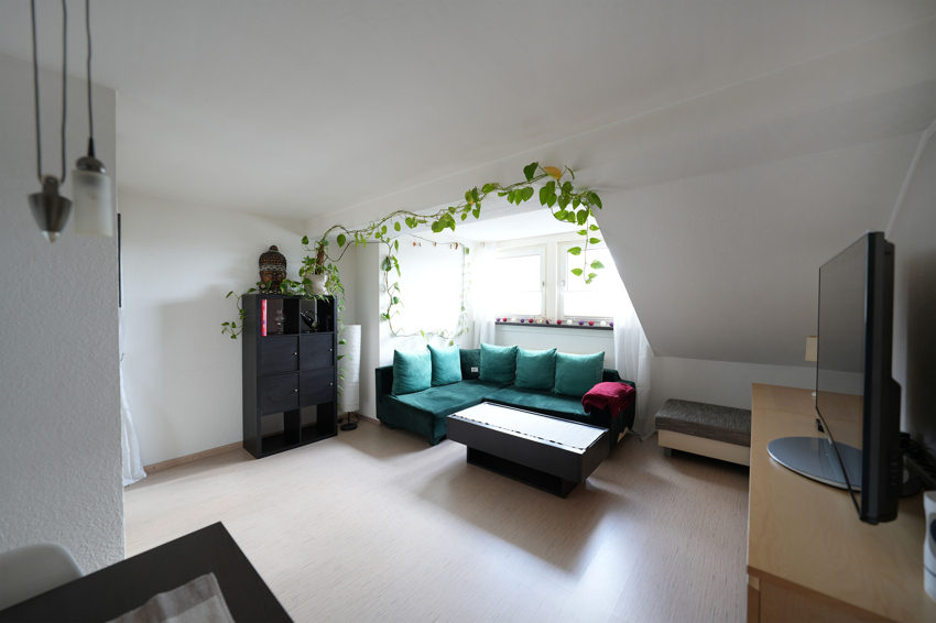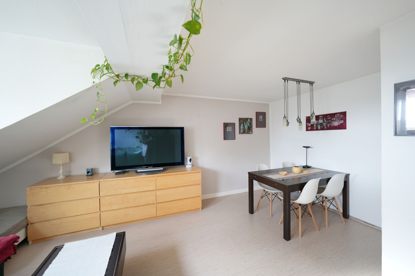 Am Ende der Diele befindet sich das Schlafzimmer. Auch hier wurde 2023 das Dachflächenfenster erneuert. Das Wohnzimmer verfügt durch die Gaube über genügend Platz für ein Sofa, auf dem Sie gemütliche Fernsehabende verbringen können, sowie über einen Essbereich, der zum Verweilen einlädt.