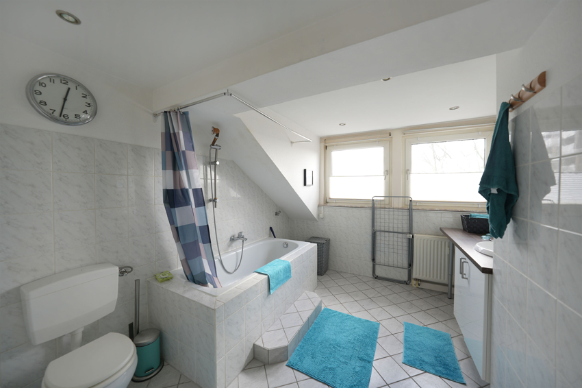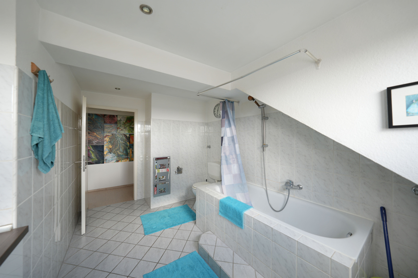 Das Highlight der Wohnung ist wohl das sehr großzügige Badezimmer mit Duschwanne und Waschtisch. Außerdem können Sie alternativ zum Waschkeller hier Ihre Waschmaschine aufstellen.