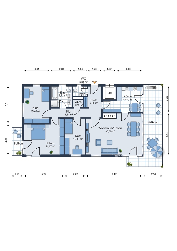 Diese 4 Zimmerwohnung befindet sich im 1. Obergeschoss des 3-geschossigen Neubaus und erstreckt sich über die gesamte Etage. Der Grundriss ist perfekt. Herzstück der Wohnung ist ohne Zweifel die große umlaufende Terrasse - Ihr Outdoor-Wohnzimmer. Der Rheinblick - unverstellt und frei, einfach umwerfend! Und der bringt Sie garantiert zu jeder Tageszeit zum Staunen.