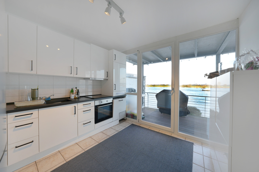 - Küche und Wohnbereich mit bodentiefen Fenstern und Blick auf den Rhein