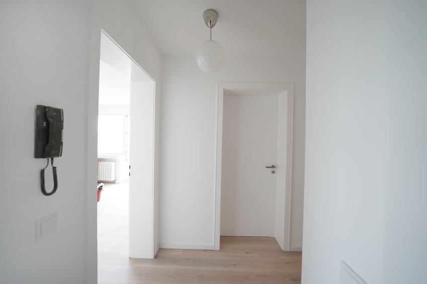 Alle Wohnräume sind mit modernem Vinylboden von Tarkett und weißen Fußleisten ausgestattet.