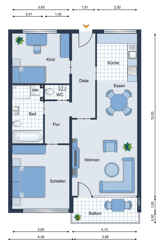 Den Eingang zur Wohnung erreichen Sie über einen offenen, überdachten Laubengang. In der großzügigen Diele haben Sie angenehm viel Platz für eine Garderobe.