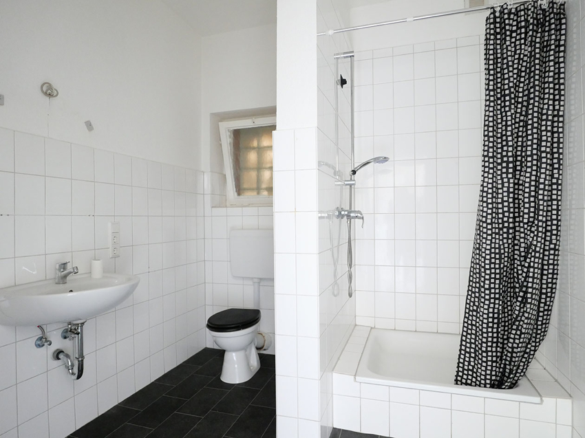 Beim Betreten der Wohnung gelangt man von der Diele aus in die große Wohnküche, das Badezimmer mit Wanne oder das Schlafzimmer.