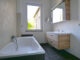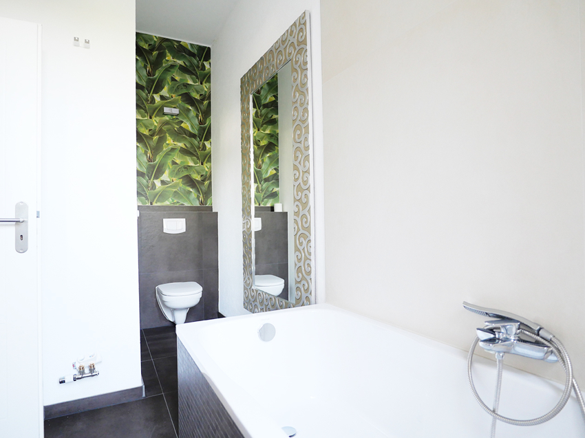 Das in 2019 sanierte Wannenbad ist mit großformatigen Fliesen und Fenster ausgestattet.