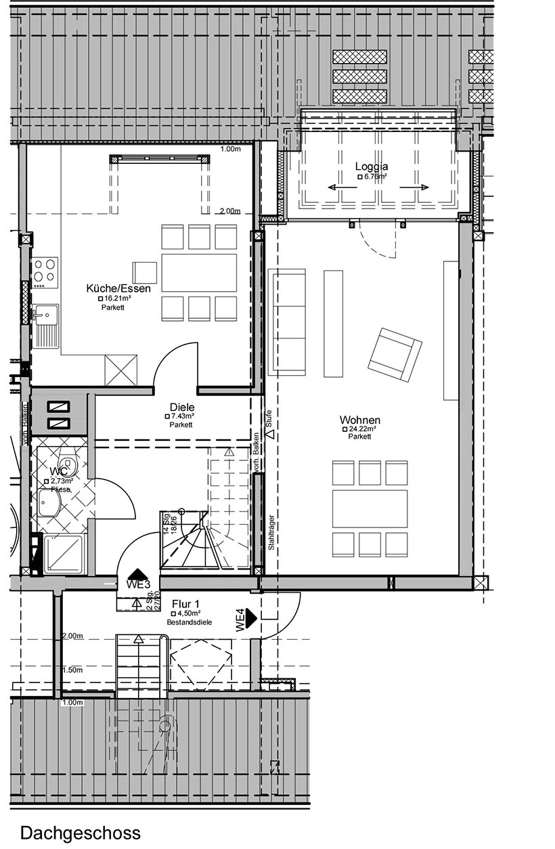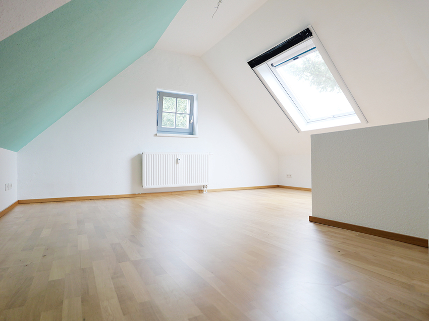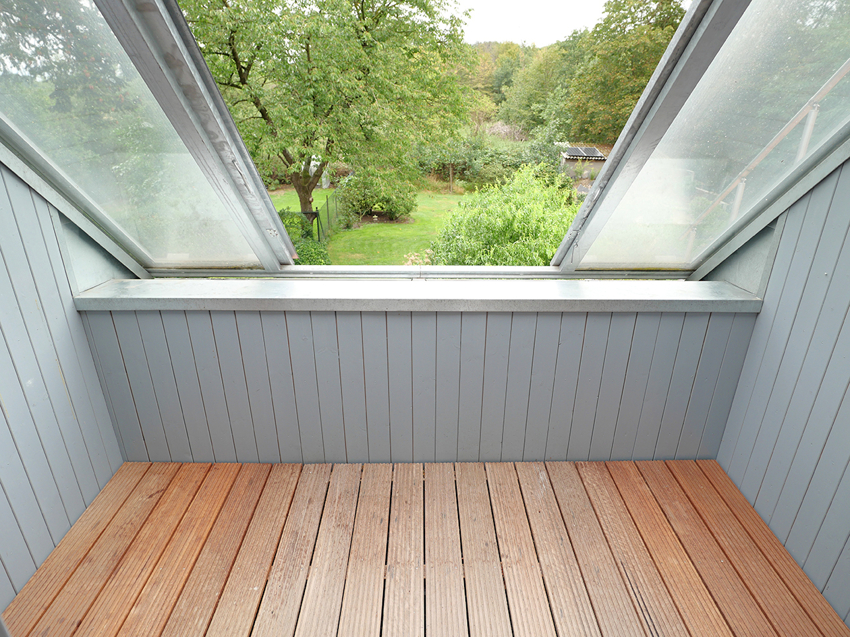 Dem Wohnzimmer verleihen die sichtbaren Dachbalken viel Gemütlichkeit. Von hier aus haben Sie Zugang zum Wintergarten. Dieser ist mit edlem Bankirai ausgestattet. Besonderes Highlight: An warmen Tagen lässt sich dieser zum Balkon umfunktionieren. Von hier aus können Sie einen herrlichen Blick ins Grüne genießen!