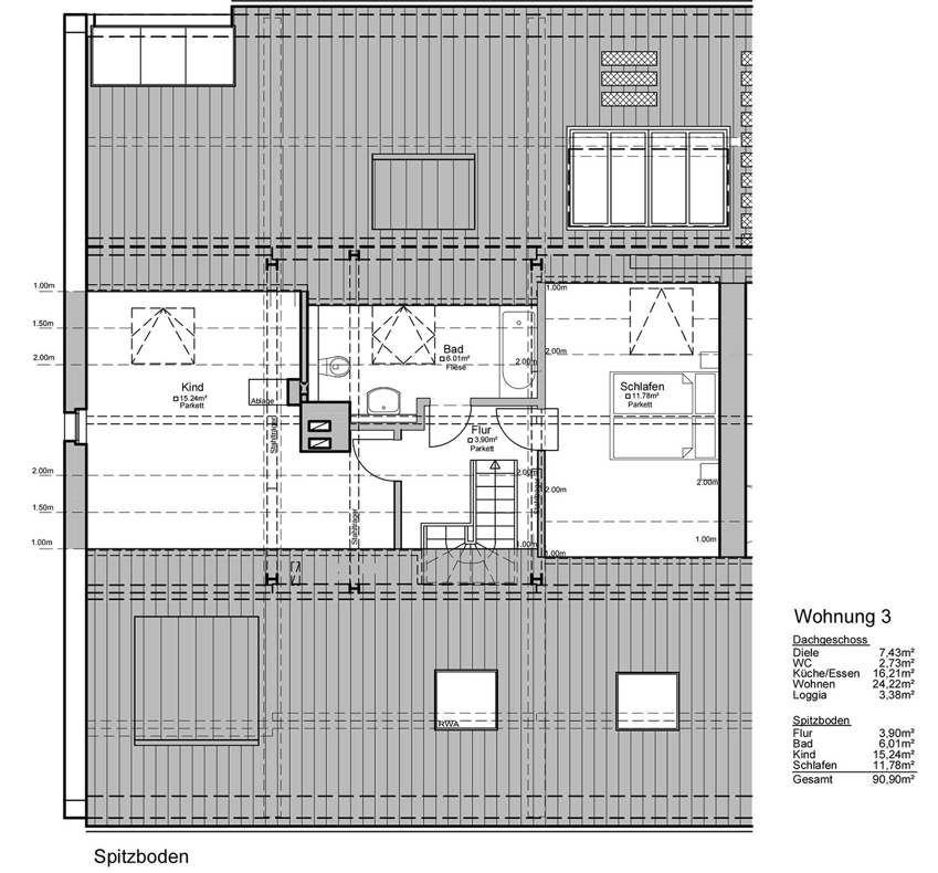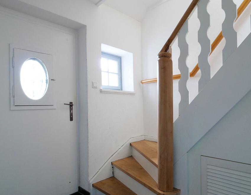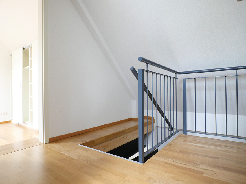 Über eine Wendeltreppe gelangen Sie in den oberen Teil der Wohnung. Dort befinden sich die beiden Schlafzimmer, wobei im kleineren Zimmer ein praktischer Einbauschrank eingerichtet wurde.