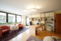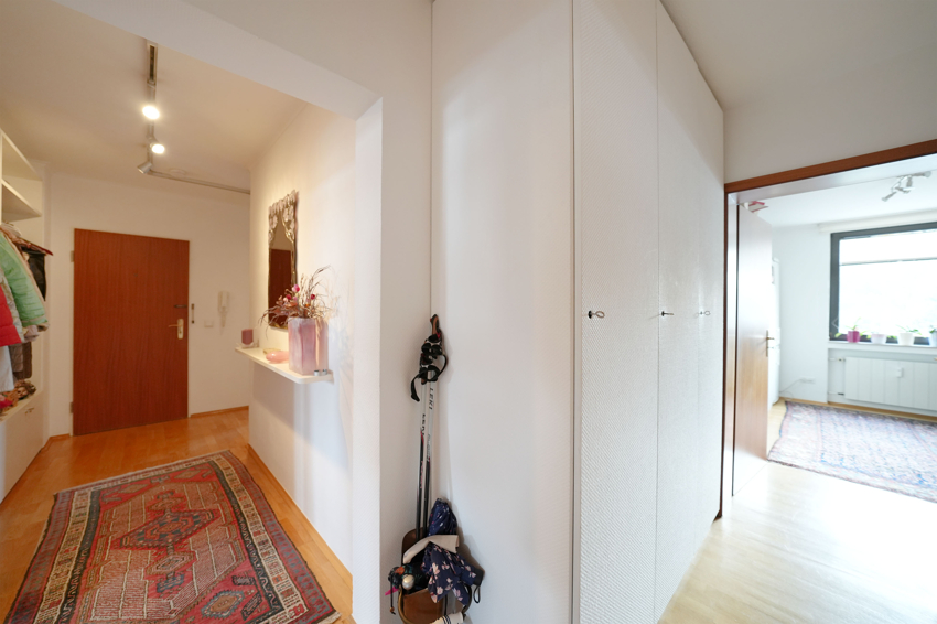 Linker Hand gelangen Sie zum schönen Wohnbereich, der idealerweise zur Südseite ausgerichtet ist und dank der vielen Fenster bereits ab vormittags die Sonne einfängt. Von hier aus haben Sie Zugang zu einem der beiden Balkone. Die angrenzende Küche mit hochwertiger Bulthaup-Einbauküche (teils erneuerte Geräte) überzeugt mit idealer Größe und praktischem Fenster zum Balkon.