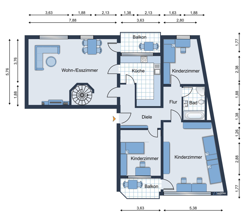 Zudem eine tolle Möglichkeit, Wohnen und Arbeiten zu verbinden. Größe und Raumaufteilung garantieren eine erstklassige Alternative zu einem Einfamilienhaus.