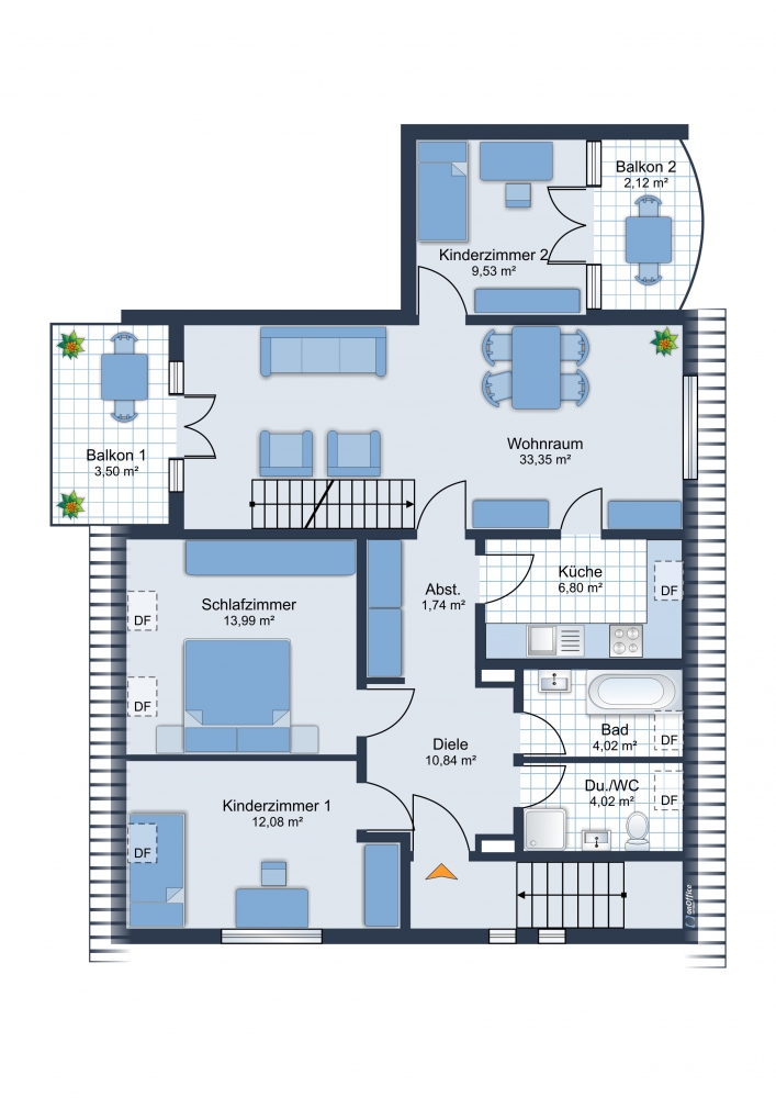 In der unteren Wohnebene gibt es 3 schöne Schlafzimmer, 2 Bäder (idealerweise Dusch- und Wannenbad), Küche und voilá, 2 Balkone. Perfekt: der sonnige Südwestbalkon schließt sich dem Wohnraum an - Ihr Lieblingsplatz an der frischen Luft.
